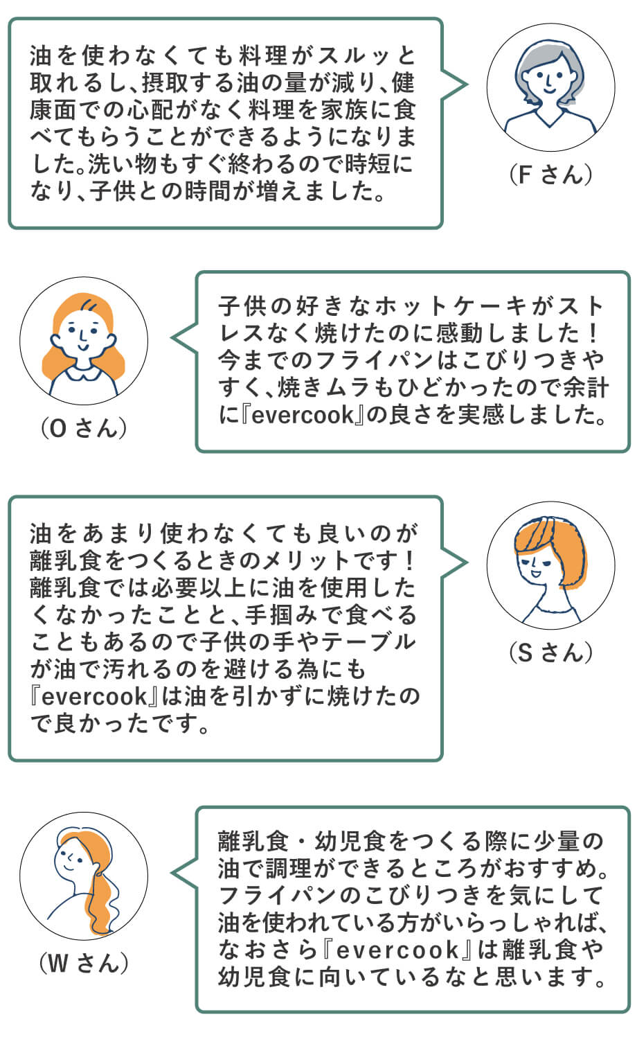 また、家族のために何品も作って喜ばせたいのに、大きなフライパンを毎回洗うのがしんどいという時もevercook(エバークック)なら、一品作り終わったらキッチンペーパーで拭いて、もう一品作れます!