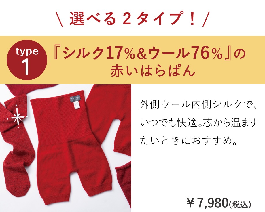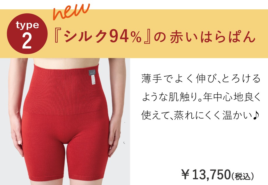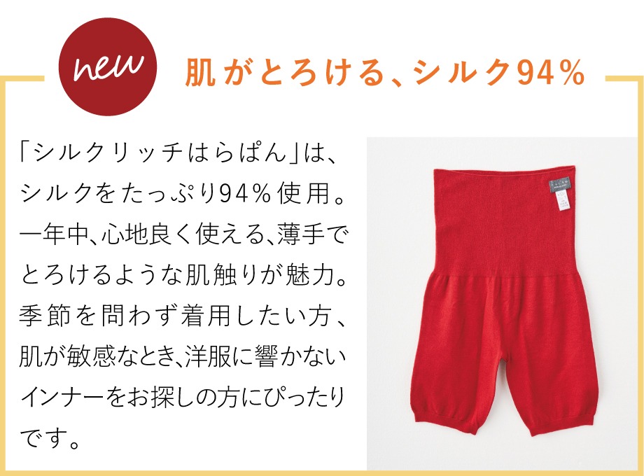 贈り物にもおすすめの「はらぱん(腹巻パンツ)」は内側シルク、外側ウールの腹巻と毛糸のパンツが合体したようなあったかインナーです。シルク&ウールタイプに加え、シルク94%使用の「シルクリッチはらぱん」が仲間入りしました。薄手でよく伸び、とろけるような肌触りです。ご自身に合った「はらぱん」をお選びいただけます。