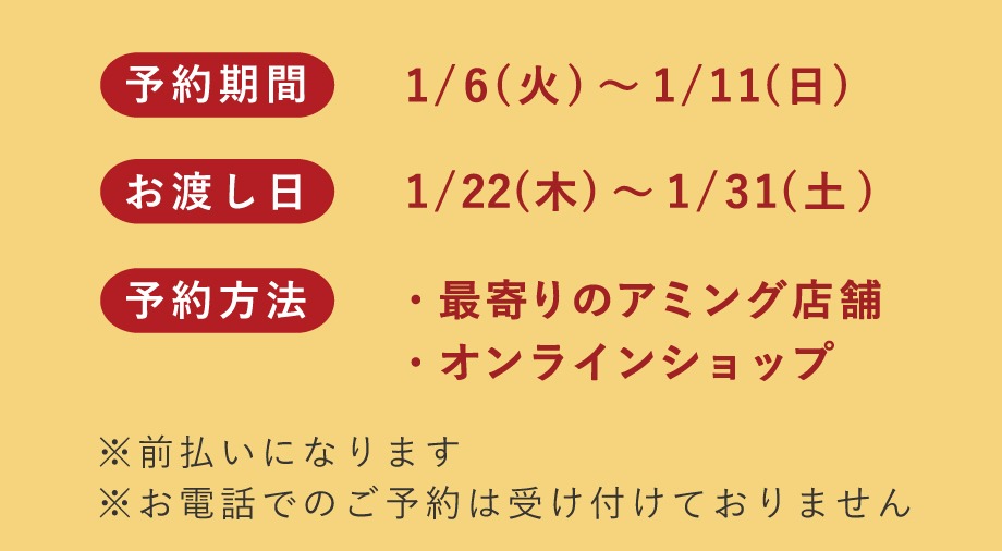 店頭、オンラインショップにてご予約・前払いとなります