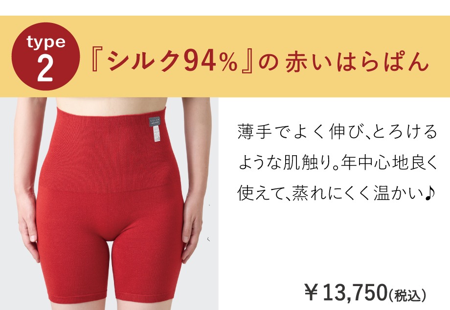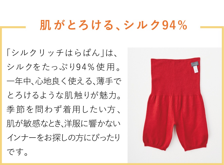 贈り物にもおすすめの「はらぱん(腹巻パンツ)」は内側シルク、外側ウールの腹巻と毛糸のパンツが合体したようなあったかインナーです。シルク&ウールタイプとシルク94%使用の「シルクリッチはらぱん」の2タイプからご自身に合った「はらぱん」をお選びいただけます。
