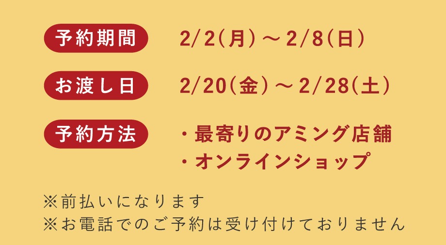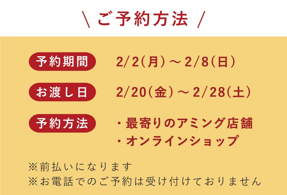 ※お渡し期間内での受け取りが難しい場合は、あらかじめご予約いただいた店舗までご連絡をお願いいたします