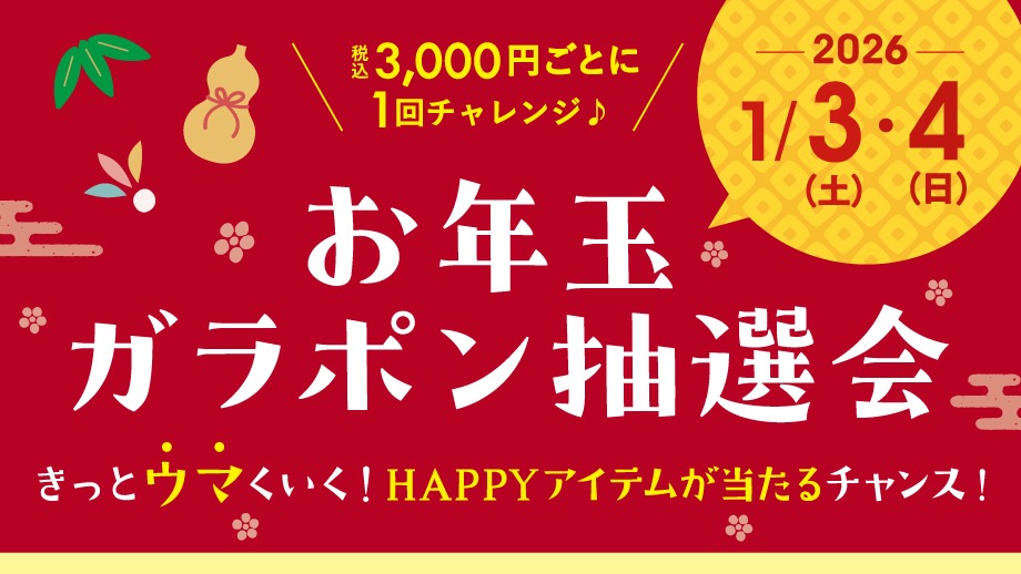 【実店舗限定】1/3(土)・4(日)いよいよ開催!抽選でHAPPYアイテムが当たる!2026年お年玉ガラポン抽選会