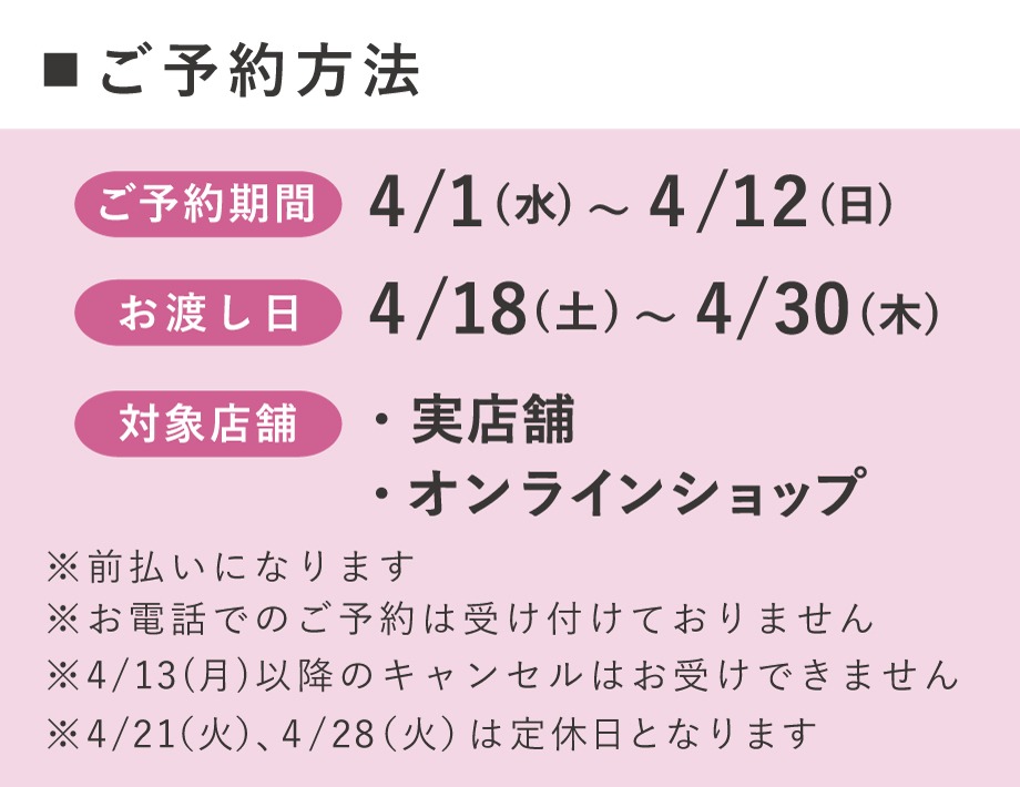 ※お渡し期間内でのお受け取りが難しい場合は、あらかじめご予約いただいた店舗までご連絡をお願いいたします