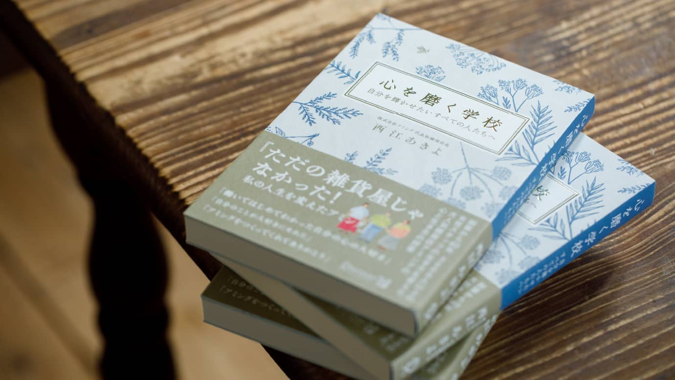 「人の役に立てることが幸せ」。そんな気持ちを大切にしながら日々お店づくりに向き合う私たちの心の指針となっているのが、オーナー・西江あきよの著書『心を磨く学校』です。この本には、西江オーナーがスタッフに語り続けてきた、人としてのあり方や、働くことの意味が綴られています。