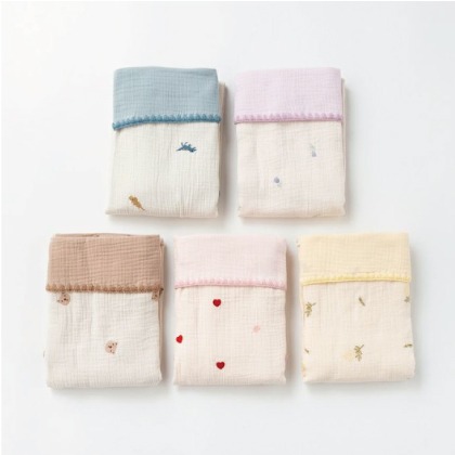 赤ちゃんの肌にやさしい綿100%。洗うたびに風合いが増す、ふわっとやわらかい4重ガーゼ仕上げ。空気がふくまれるのでふわふわとした生地感になります。