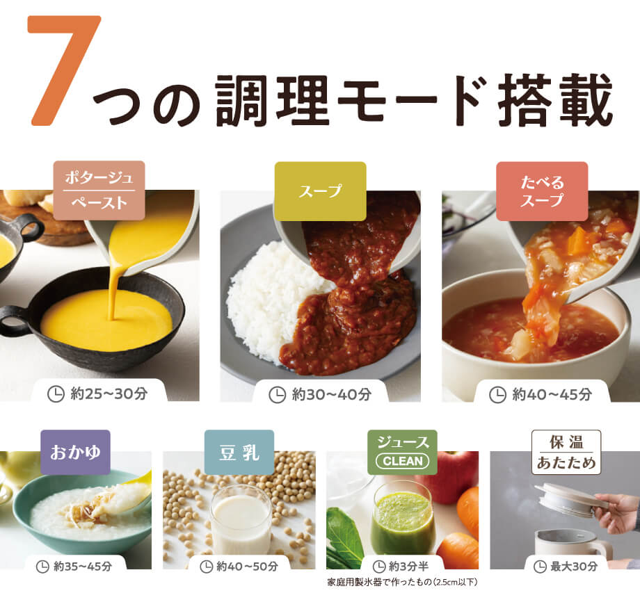 800mlは、4人家族(大人2人+子供2人など)の夕食でちょうどいい量が簡単につくれます♪なめらかなポタージュがつくれる「ポタージュ/ペースト」をはじめ、便利な7種類の調理モードを搭載。新しく加わった「たべるスープ」では、具材のごろごろ感を楽しめる料理もつくれて、モードの選択により幅広い食感のバリエーションを実現♪