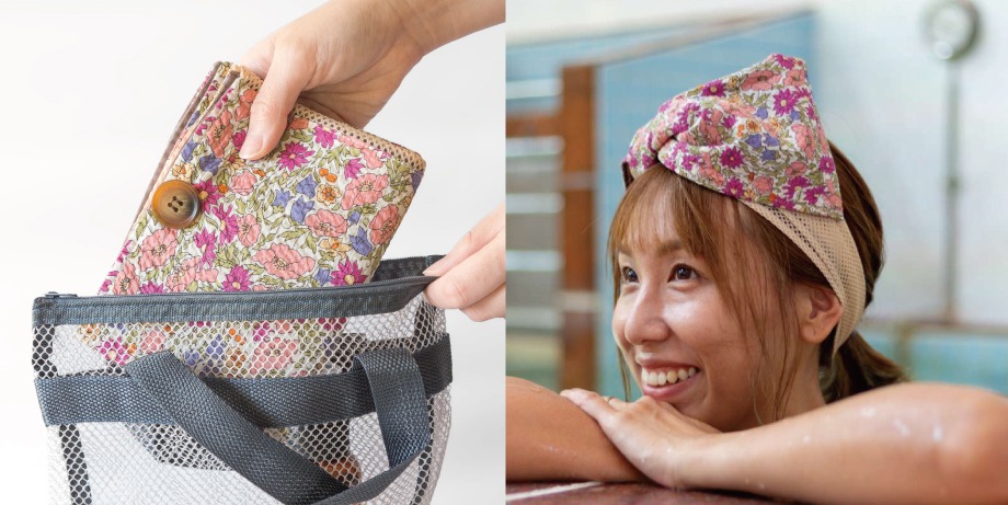 胸元にスナップボタンが付いていて、しっかりとカバーできるデザイン。湯船につかるときは頭に巻いても、かわいくお使いいただけます。首元はメッシュ仕様で、頭を洗うときも水やシャンプーが溜まりにくく、ぬめり感を軽減。胸元の部分の生地は水はけがよく、サラッとした肌触りで乾きやすいのも◎