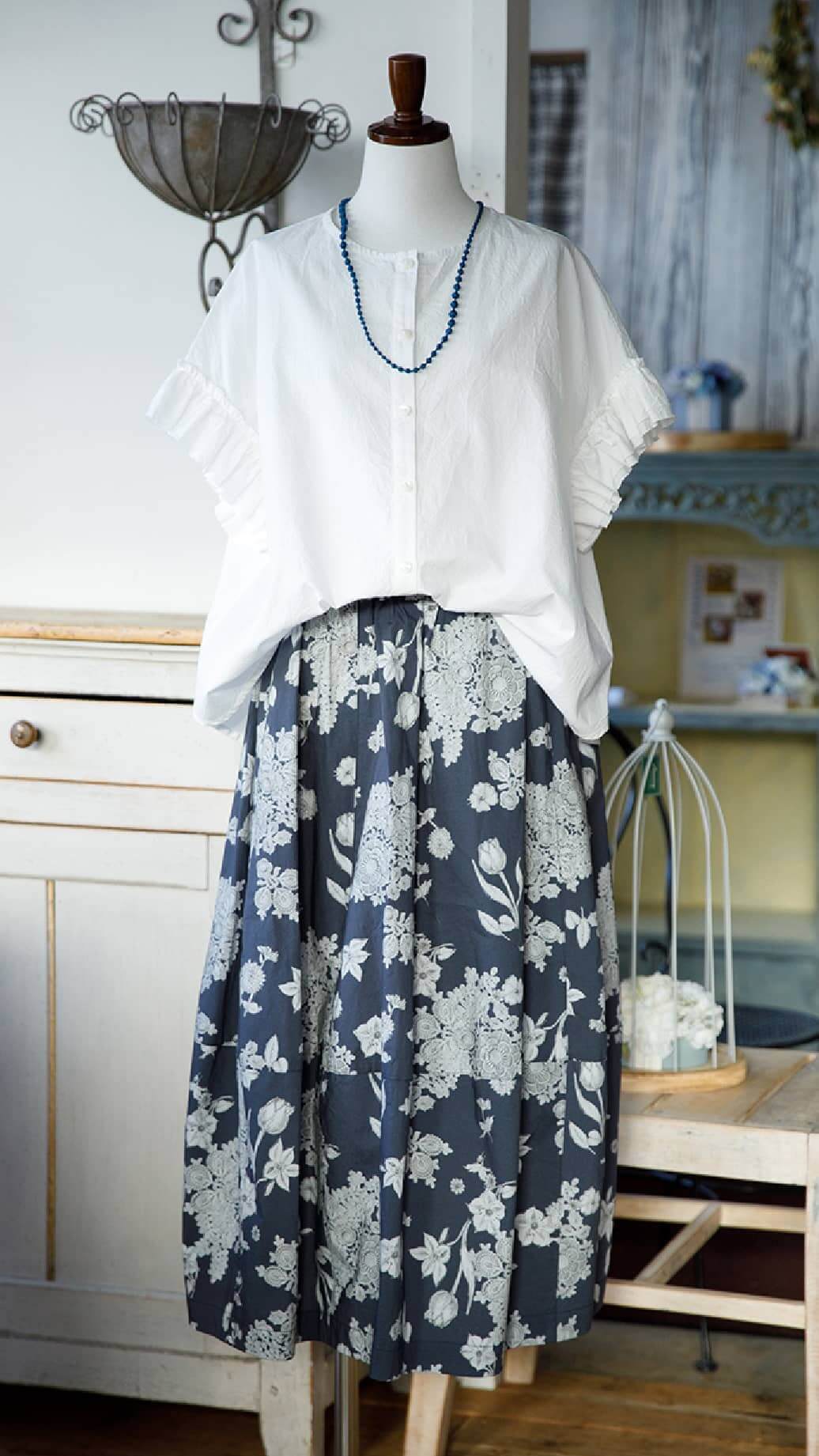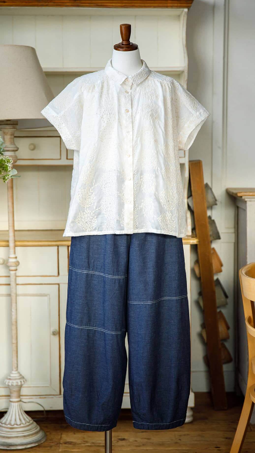 トップスは袖が短めのシャツブラウスで、若々しく。袖周りにゆとりがあり、酷暑の中でも涼しく過ごせる設計になっています。