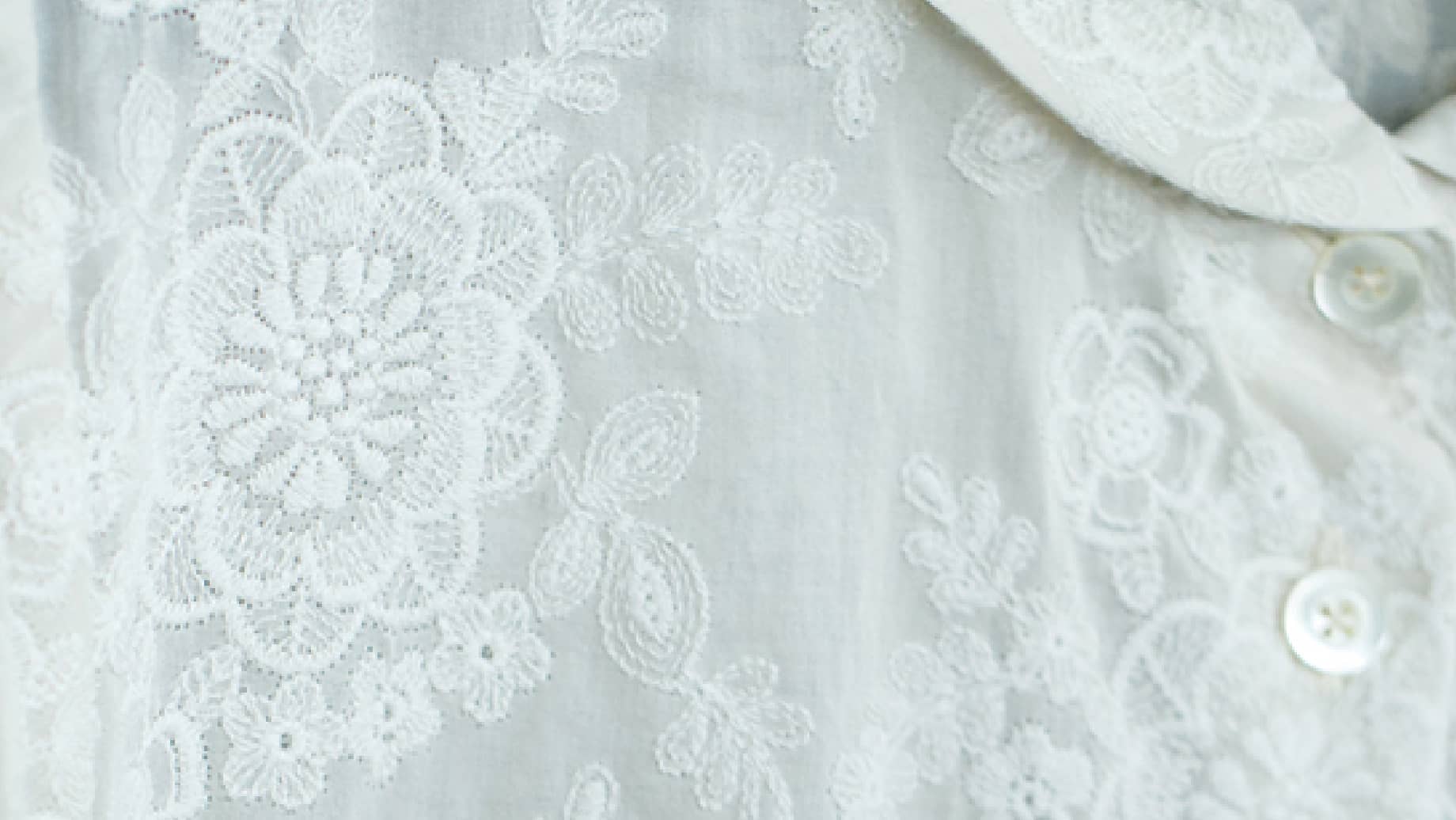 ブランドを象徴する特色のひとつが「エンブロイダリー刺繍」です。 刺繍に使用する細い糸は切れやすいため、あえて低速でゆっくり織り上げていきます。 刺繍の上にさらに刺繍を重ねる「2度掛け」という工程によって、 ふっくらとした美しい立体感が生まれます。