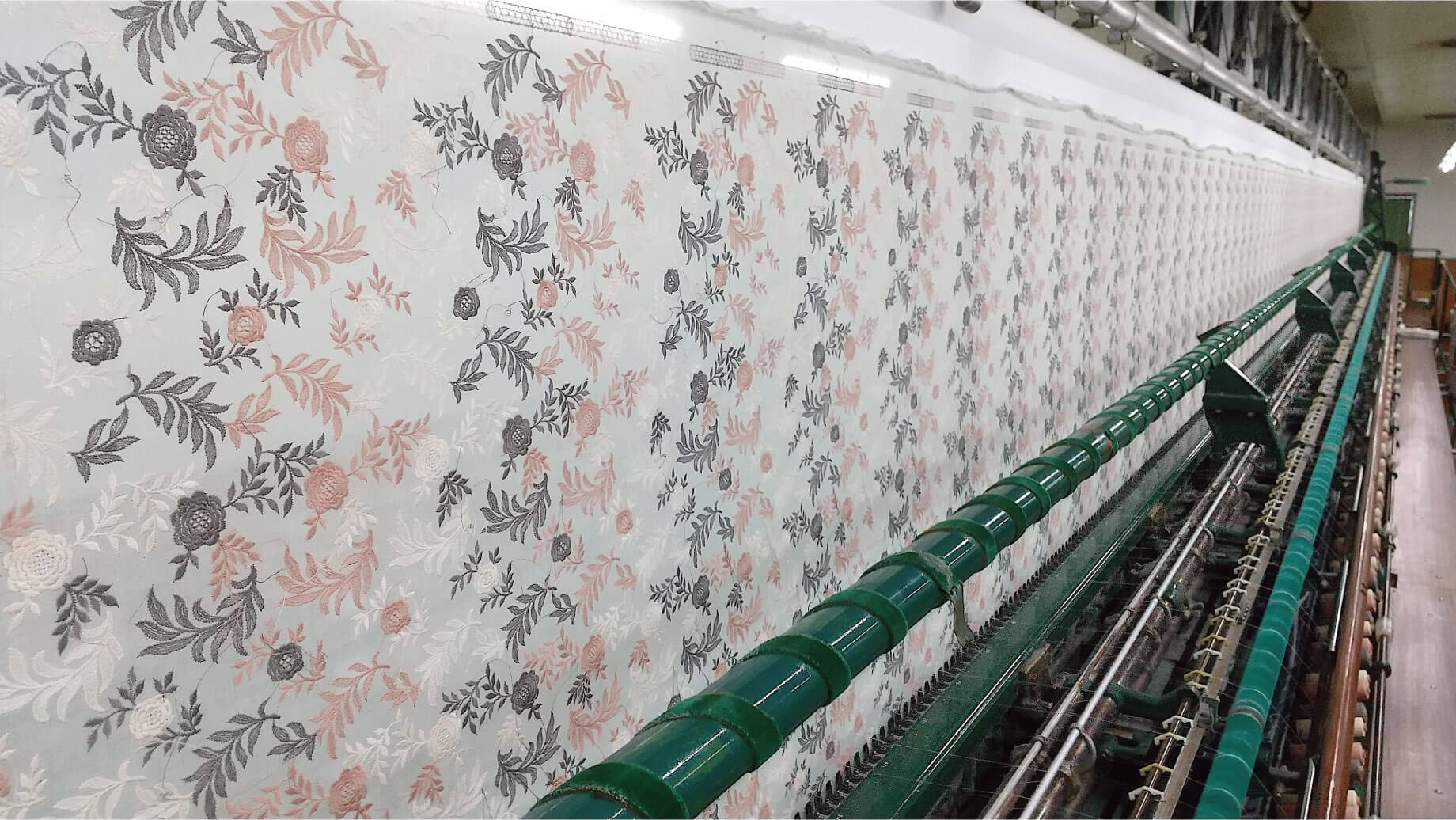 デザインされた図案は、日本各地の小さな機屋(はたや)さんの手によって、繊細なレース生地や刺繍生地に仕上げられます。糸選びや染色から始まる生地づくりは、発案から完成までに1年以上かかることも少なくありません。