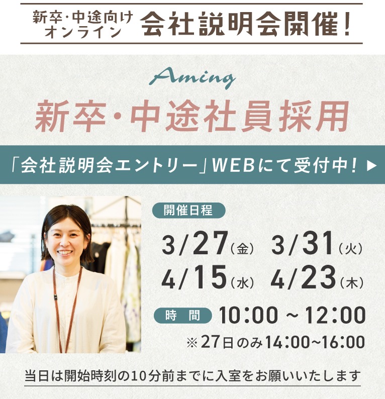 アミングは「手に届く暮らしの幸せ」をコンセプトに、いつ足を運んでも、新しいモノやコトとの出会いがあり、心がワクワクする。そんな「素敵」があふれるお店づくりを目指しています。