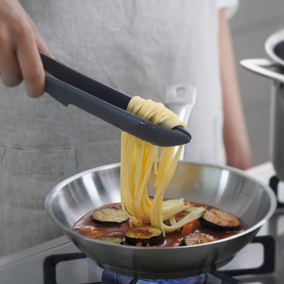 このトングは先端がぴったり合うので細かいものもつかみやすく、先端部分には食材や鍋・フライパンにやさしいシリコーンゴムを使用しているので、嫌な金属音がしないところもお気に入りのポイントです。パスタ1本でもしっかりつかめます。分解して洗えて、コンパクトに収納できるのもうれしいポイント。気づくとこのトングばかり使っています。