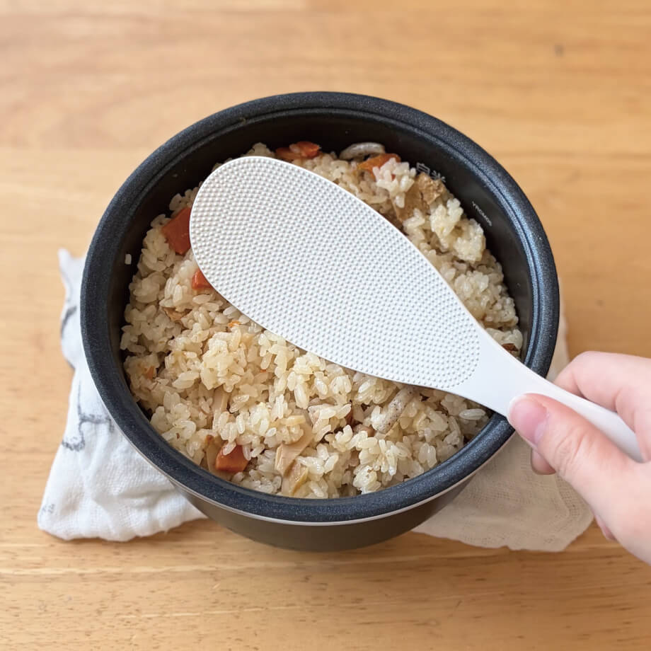もう一つの愛用品が『marna(マーナ)』の「極みしゃもじ」です。初めて使ったとき「これはすくいやすい!」と驚きました。すくう面が広くつくられているので、軽い力でご飯をよそうことができ、混ぜご飯もふんわりとほぐせます。特殊エンボス加工でお米がつきにくく、ストレスなく使えるのもうれしいポイント。今では他のしゃもじには戻れません!
