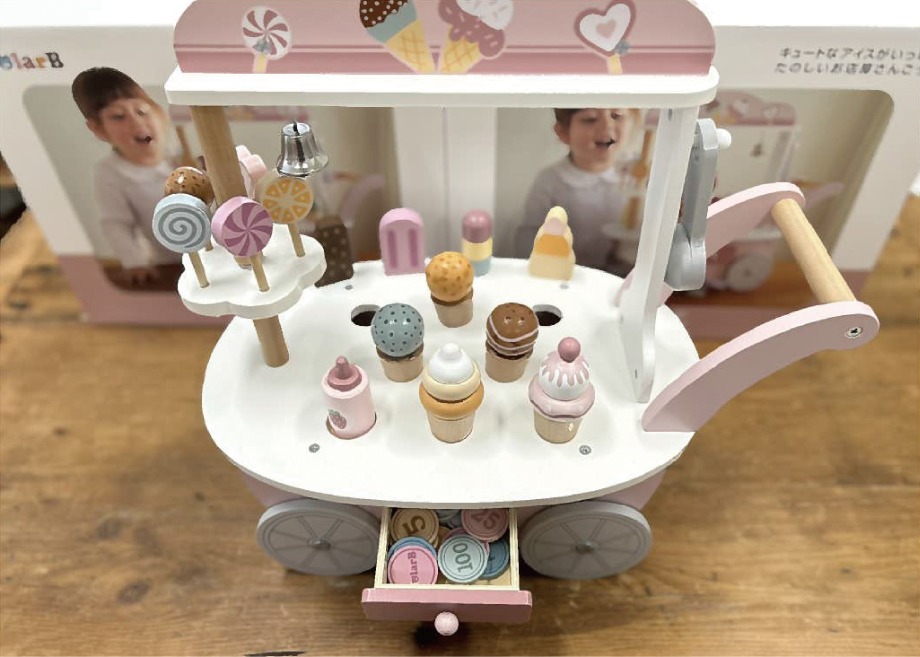 いろんな種類のアイスクリームとかわいいワゴンがセットになった、お店屋さんごっこが楽しめるおもちゃです。