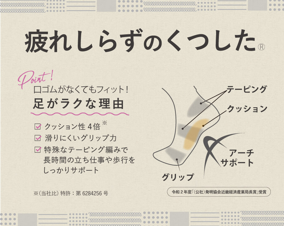 特殊なテーピング編みで足をしっかりサポートし、長時間の立ち仕事や歩行も快適に。クッション性は当社比4倍(※)で、毎日履きたくなる一足です。